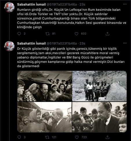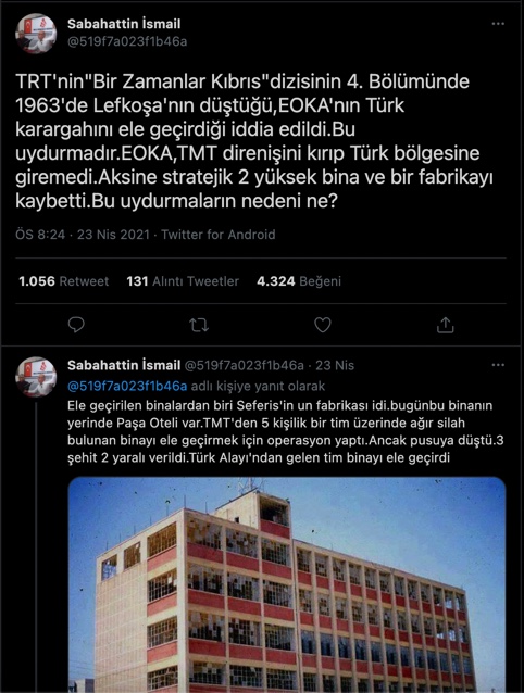 “TRT’nin ‘Bir Zamanlar Kıbrıs’ dizisinin 4. Bölümünde 1963’de Lefkoşa’nın düştüğü, EOKA’nın Türk karargâhını ele geçirdiği iddia edildi. Bu uydurmadır” diyen İsmail, aslında söz konusu olayın tam tersi şekilde sonuçlandığını yazdı.
