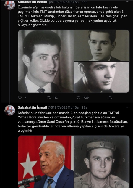 “EOKA, Türk Mukavemet Teşkilatı’nın (TMT) direnişini kırıp Türk bölgesine giremedi. Aksine stratejik 2 yüksek bina ve bir fabrikayı kaybetti. Bu uydurmaların nedeni ne” ifadelerini kullanan İsmail, şu tweetleri attı: