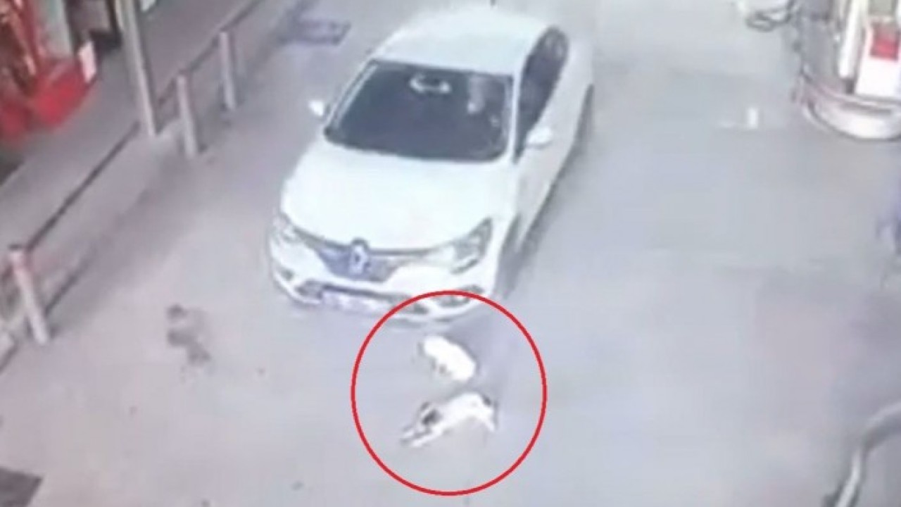 Olay, dün sabah saatlerinde Erdek ilçesindeki bir benzin istasyonunda meydana geldi. Benzin istasyonuna gelen sürücüsünün ismi öğrenilemeyen otomobil, pompaların önünde yatan iki köpeğin üzerinden geçti.