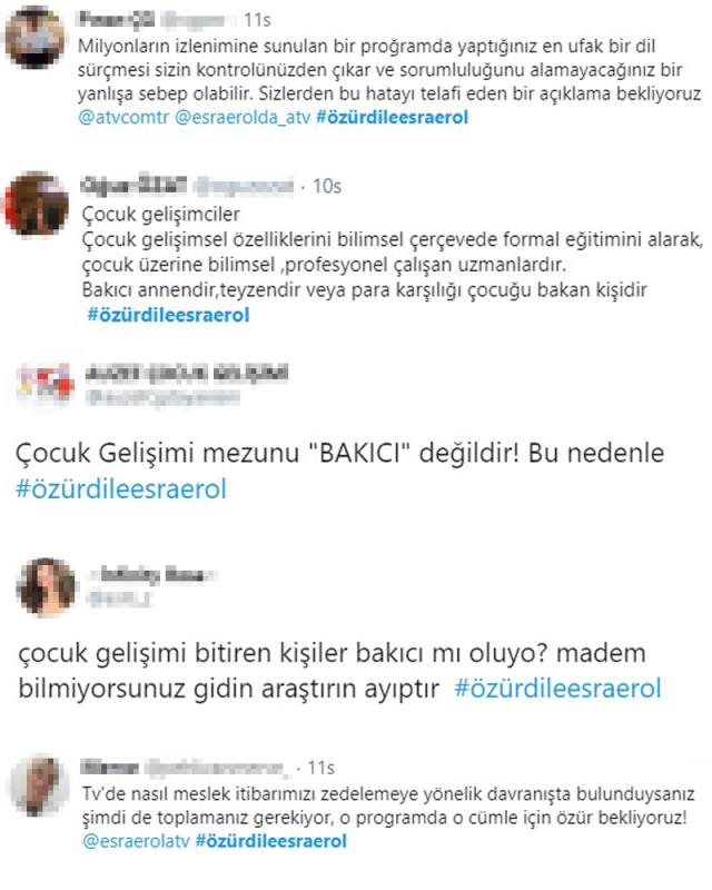 Esra Erol'un bu sözleri yanlış anlaşılınca Twitter'da tepkiler çığ gibi büyüdü. Binlerce çocuk gelişimi mezunu "Hayatın hiçbir yerinde bakıcı" değiliz diyerek ünlü isme tepki gösterdi. Erol'a tepkilerin yanı sıra birçok hayranından da destek geldi. Esra Erol'un sözlerinin yanlış anlaşıldığını söyleyen bazı sosyal medya kullanıcıları "Özür dilenecek bir şey yok" diyerek paylaşımlar yaptı.