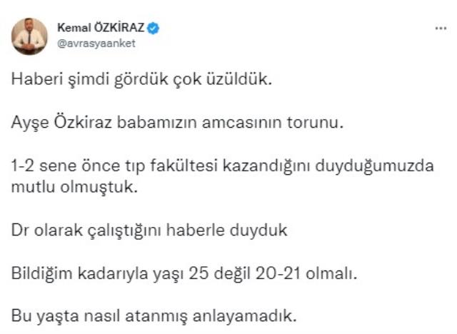 Sosyal medya üzerinden açıklama yapan Özkiraz, "Haberi şimdi gördük çok üzüldük. Ayşe Özkiraz babamızın amcasının torunu. 1-2 sene önce tıp fakültesi kazandığını duyduğumuzda mutlu olmuştuk. Dr. olarak çalıştığını haberle duyduk. Bildiğim kadarıyla yaşı 25 değil 20-21 olmalı." ifadelerini kullandı.