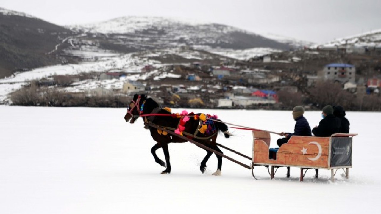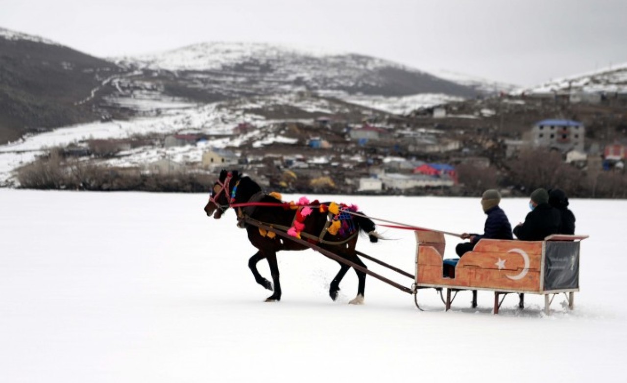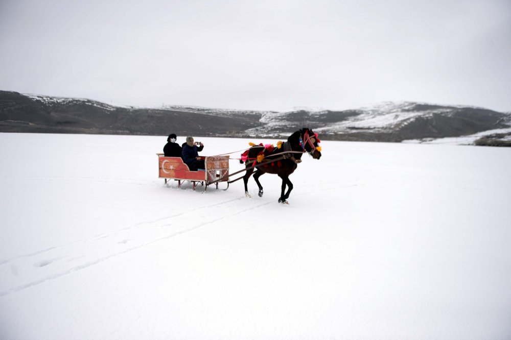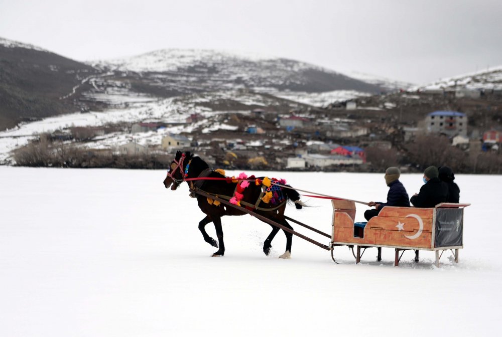 Buz kalınlığı yaklaşık 40 santimetreyi bulan karla kaplı göl üzerinde atlarını dört nala koşturan kızakçılar, misafirleri ilkbahar mevsiminin ilk ayı olan martta da gezdirmeyi sürdürüyor.