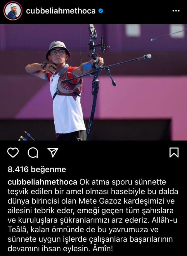 Cübbeli Ahmet, Mete Gazoz'un fotoğrafını paylaşarak "Ok atma sporu sünnette teşvik edilen bir amel olması hasebiyle bu dalda dünya birincisi olan Mete Gazoz kardeşimizi ve ailesini tebrik eder, emeği geçen tüm şahıslara ve kuruluşlara şükranlarımızı arz ederiz. Allah-u Teala, kalan ömründe de bu yavrumuza ve sünnete uygun işlerde çalışanlara başarılarının devamını ihsan eylesin. Amin!" notu düştü.