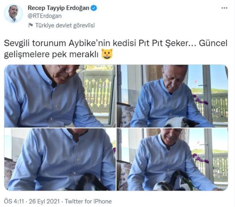 Cumhurbaşkanı Erdoğan, Instagram hesabından yaptığı paylaşımda, "Sevgili torunum Aybike’nin kedisi Pıt Pıt Şeker... Güncel gelişmelere pek meraklı" ifadelerini kullandı.