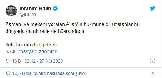 İbrahim Kalın, söz konusu etiketi kullanarak yaptığı açıklamada, "Zamanı ve mekanı yaratan Allah’ın hükmüne dil uzatanlar bu dünyada da ahirette de hüsrandadır. İlahi hükmü dile getiren Ali Erbaş yalnız değildir" ifadesini kullandı.