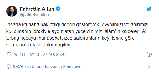 Fahrettin Altun ise Twitter paylaşımında, "Ali Erbaş hocaya münasebetsizce saldıranların keyiflerine göre sorgulanacak kaideler değildir" sözlerini sarf etti.