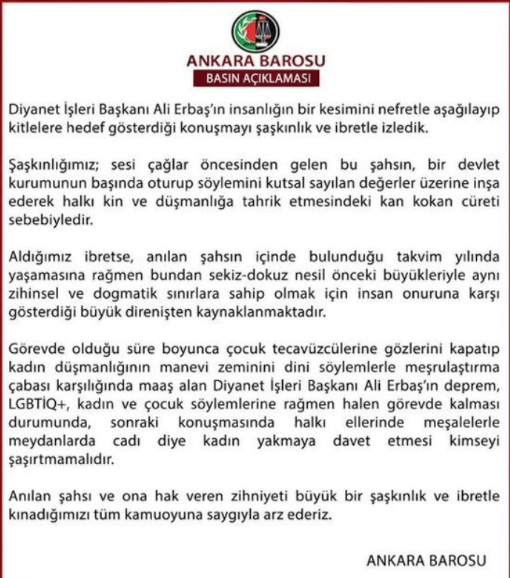 Diyanet İşleri Başkanı Ali Erbaş'ın cuma hutbesinde eşcinseller ve eşcinsellikle ilgili sözleri gündeme oturdu. Prof. Dr. Ali Erbaş'a ilk tepki Ankara Barosu'ndan 'ağır bir üslupla' suç duyurusu olarak gelmişti. Türkiye Düşünce Platformu, Ankara Barosu ve İHD'nin suç duyurusunu "şeytani bir meydan okuma" olarak değerlendirirken, tartışmaya Cumhurbaşkanlığı Sözcüsü İbrahim Kalın ve İletişim Başkanı Fahrettin Altun da dahil oldu.