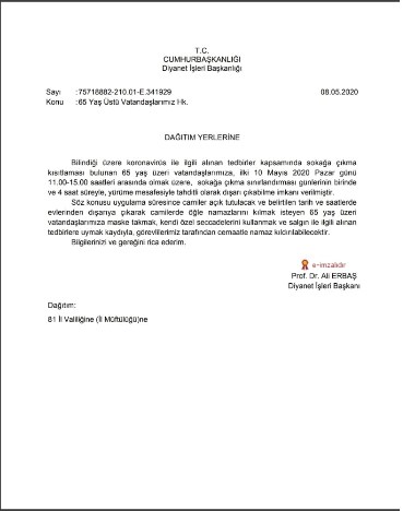 Diyanet İşleri Başkanı Ali Erbaş imzasıyla 81 ilin valiliklerine gönderilen yazıda Pazar günü 11.00-15.00 saatleri arasında dışarı çıkabilecek 65 yaş üstü yurttaşların, “Kendi seccadelerini kullanmak” şartıyla öğle namazını camilerde kılabileceği belirtildi
