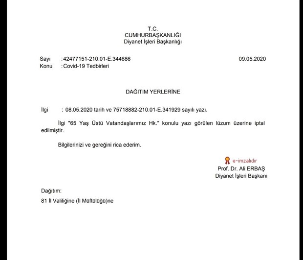 Ancak bu karar tepki çekince Diyanet İşleri Başkanlığı, "65 yaş üstü vatandaşlarımız konulu yazı görülen lüzum üzerine iptal edilmiştir" denildi.