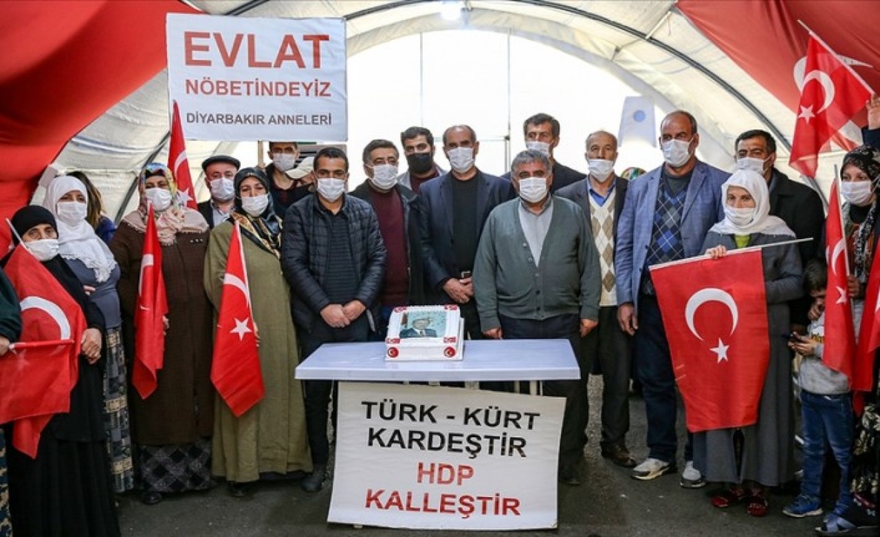 Dağa kaçırılan çocukları için HDP il binası önünde evlat nöbetini sürdüren aileler, üzerinde Cumhurbaşkanı Recep Tayyip Erdoğan'ın fotoğrafı bulunan pastayı devlet korumasındaki çocuklara gönderdi.