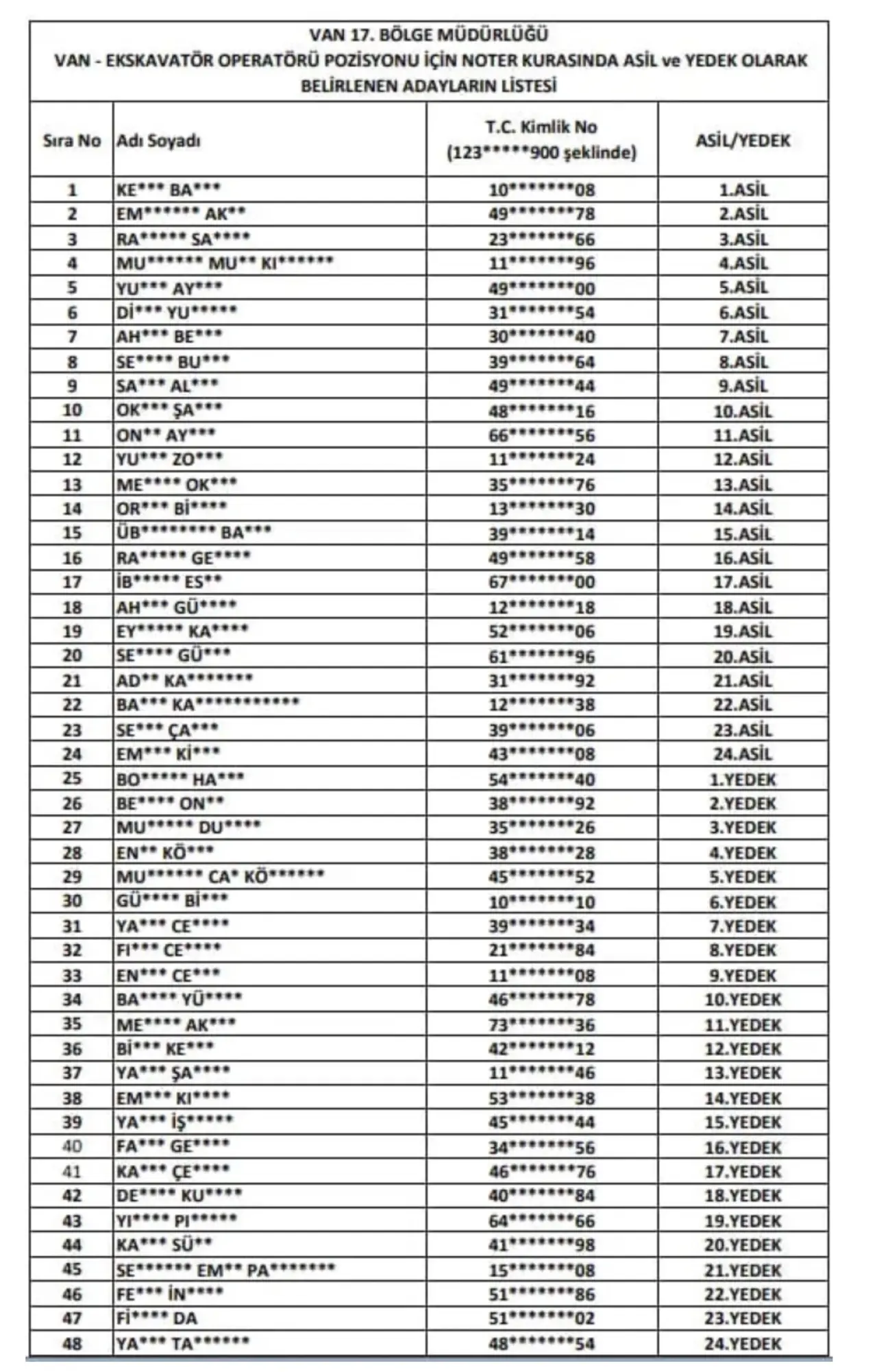 Asil listede yer alan adayların istenen belgeleri 16 Mart 2026 ile 27 Mart 2026 tarihleri arasında teslim etmesi gerekiyor. Evraklar, DSİ 17. Bölge Müdürlüğü’ne elden verilecek. Teslim adresi ise Yeni Mahallesi 2021. Sokak No:10 Edremit / Van olarak açıklandı.