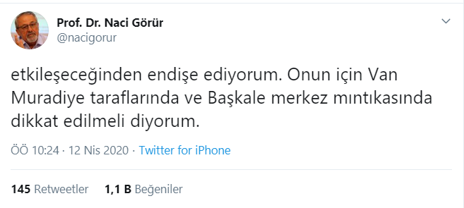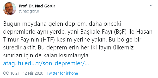 Kişisel Twitter hesabından açıklamalarda bulunan Prof. Dr. Naci Görür, Van Muradiye taraflarında ve Başkale merkez mıntıkasını işaret etti.