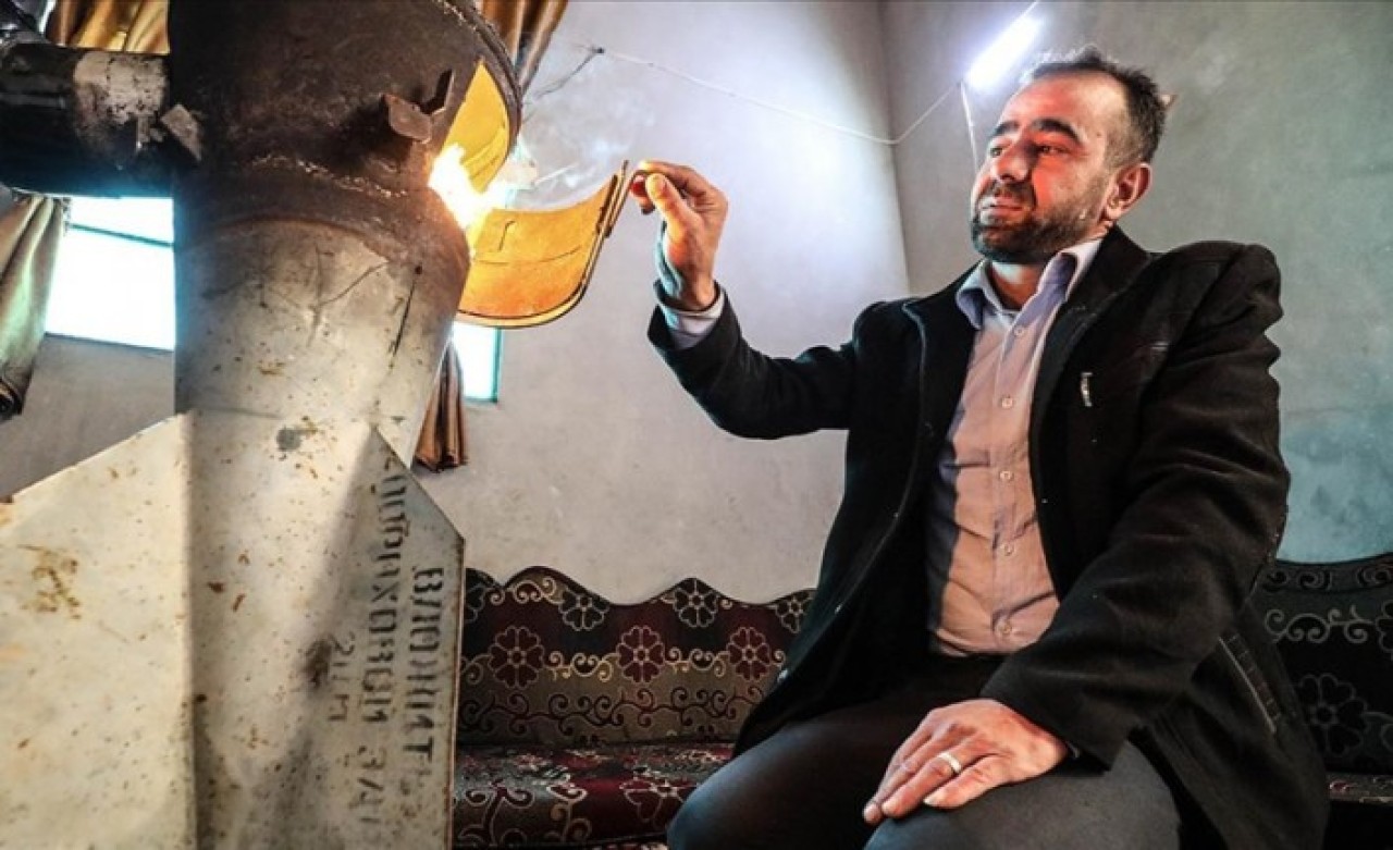 Osman da evini yerle bir eden roketten geriye kalan kovanı, kiraladığı yeni evinin ısınması için sobaya dönüştürdü.
