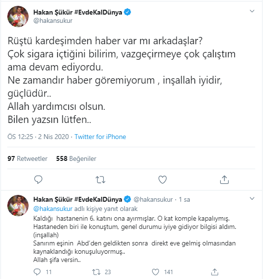 Kişisel twitter hesabından paylaşımda bulunan Şükür, "Rüştü kardeşimden haber var mı arkadaşlar? Çok sigara içtiğini bilirim, vazgeçirmeye çok çalıştım ama devam ediyordu. Ne zamandır haber göremiyorum , inşallah iyidir, güçlüdür.. Allah yardımcısı olsun. Bilen yazsın lütfen..