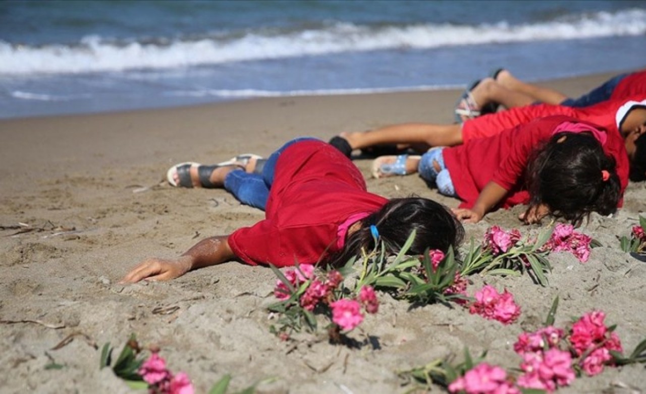 Sahile begonvil çiçekleriyle "Aylan Baby" yazıldı. Aralarında çocukların da bulunduğu grup, aynı Alan bebeğin cansız bedeninin sahile vurduğu gibi kıyıya uzanarak, mültecilerin yaşadığı drama dikkat çekmeye çalıştı.