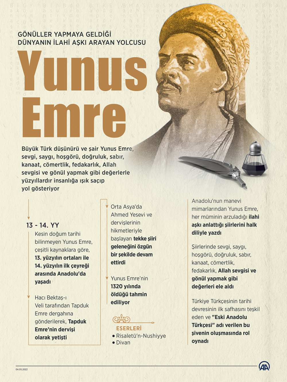 Anadolu'nun manevi mimarlarından, her müminin arzuladığı ilahi aşkı anlattığı şiirlerini halk diliyle yazan Yunus Emre, Türkiye Türkçesinin tarihi devresinin ilk safhasını teşkil eden ve "Eski Anadolu Türkçesi" adı verilen bu şivenin oluşmasında rol oynadı.