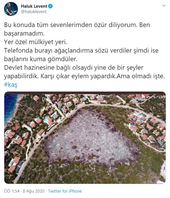 Sosyal medya hesabından özür mesajı paylaşan Levent, “Yer özel mülkiyet yeri. Telefonda burayı ağaçlandırma sözü verdiler şimdi ise başlarını kuma gömdüler” dedi.
