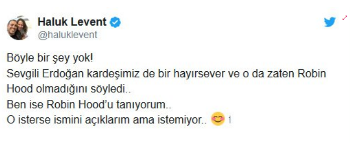 Levent, “Böyle bir şey yok. Sevgili Erdoğan kardeşimiz de bir hayırsever ve o da zaten Robin Hood olmadığını söyledi. Ben ise Robin Hood'u tanıyorum. O isterse ismini açıklarım ama istemiyor” dedi.