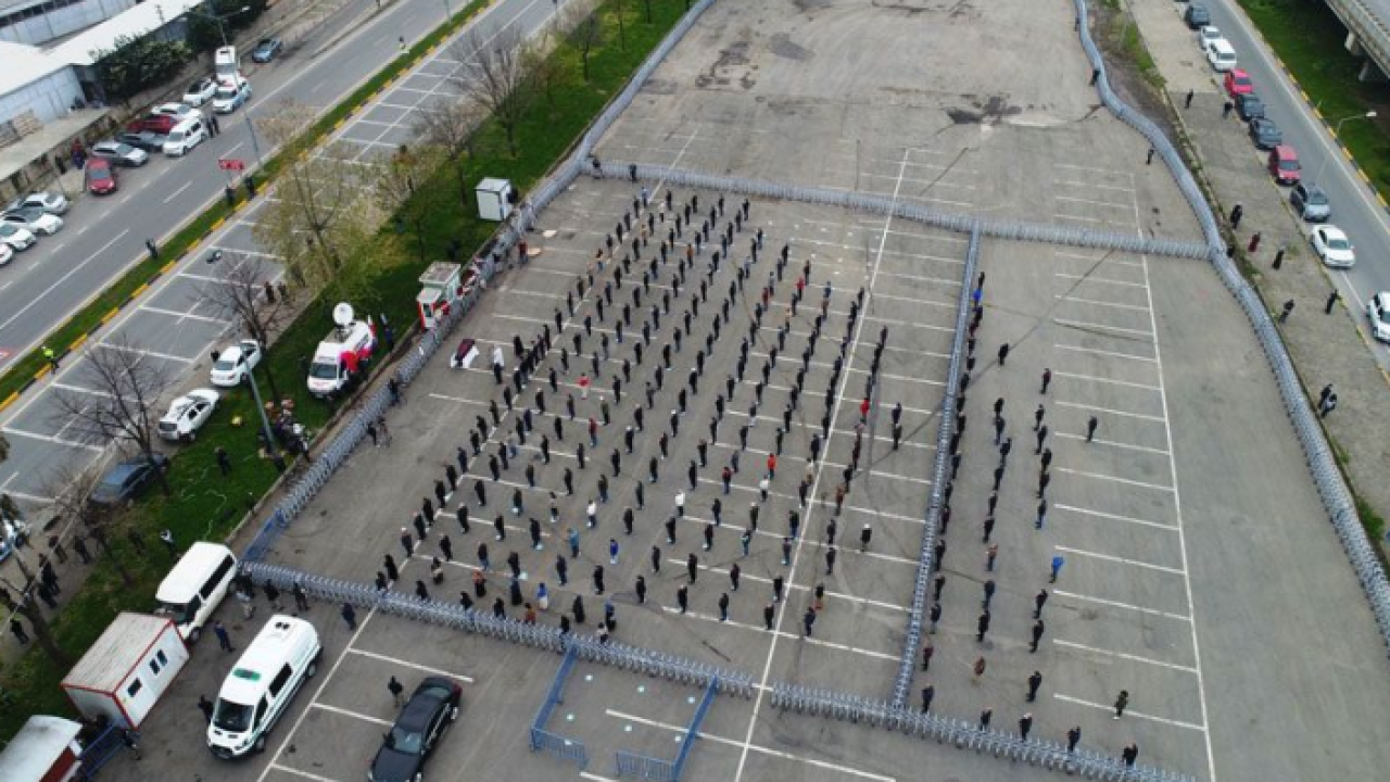 Koronavirüs tedbirleri kapsamında sosyal mesafe kuralına uyulması için alanda vatandaşların duracağı alanlar işaretlendi.