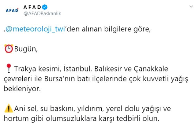 Meteoroloji Genel Müdürlüğü tarafından yurdun batı kesiminde kuvvetli gök gürültülü sağanak, Marmara Bölgesi'nde ise bu sabah saatlerinden itibaren sağanak ve dolu yağışı beklendiği açıklanmıştı.