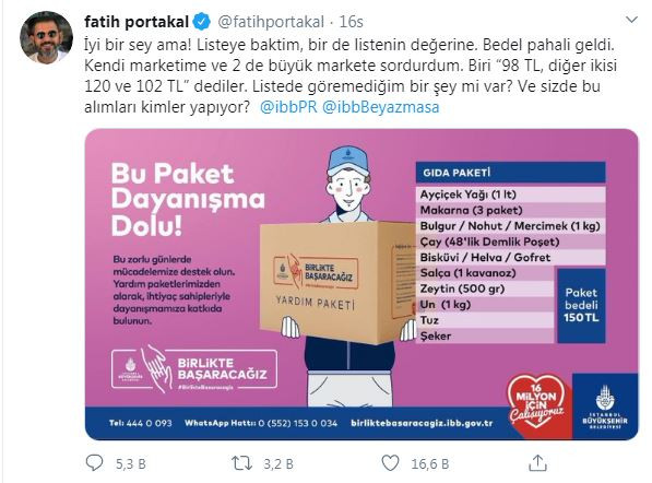 Fatih Portakal resmi Twitter hesabı üzerinden İBB'yi etiketleyerek, "İyi bir şey ama! Listeye baktım, bir de listenin değerine. Bedel pahalı geldi. Kendi marketime ve 2 de büyük markete sordurdum. Biri “98 TL, diğer ikisi 120 ve 102 TL” dediler. Listede göremediğim bir şey mi var? Ve sizde bu alımları kimler yapıyor? " isyanında bulundu.