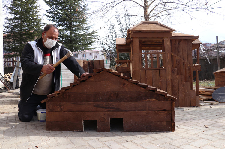 Kaymakamlıkça TOKİ inşaatlarından toplanan atık malzemeler, Öğretmenevi bahçesinde kurulan atölye alanında usta ellerde işlenerek Hazar Gölü çevresindeki kedi, köpek ve kuşlar için sıcak yuvaya dönüşüyor.