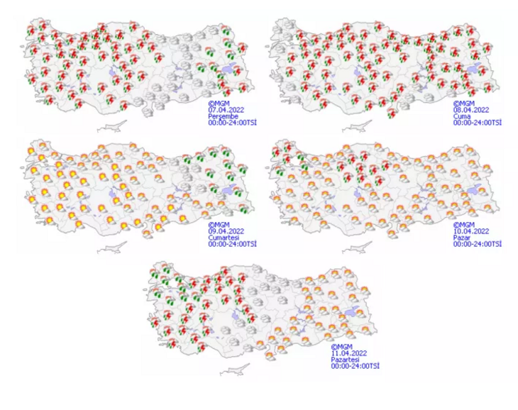 Meteoroloji Genel Müdürlüğü tarafından yapılan son değerlendirmelere göre: Ülkemiz genelinin parçalı ve çok bulutlu, Marmara, Ege, İç ve Batı Akdeniz, İç Anadolu, Karadeniz ile Doğu Anadolu'nun kuzey ve doğusunun aralıklı sağanak ve yer yer gök gürültülü sağanak yağışlı geçeceği tahmin ediliyor. Yağışların; akşam saatlerinde Batı Karadeniz ile Kocaeli, Sakarya, Yalova, Bursa, Bilecik, Çankırı ve Çorum çevreleri ile Ankara, Eskişehir ve Balıkesir'in kuzey ilçelerinde yerel olarak kuvvetli olması bekleniyor. Sabah saatlerinde Orta ve Doğu Karadeniz kıyılarında yer yer pus ve sis hadisesi bekleniyor. Doğu Karadeniz'in iç kesimleri ile Doğu Anadolu'da yüksek kar örtüsüne sahip eğimli yamaçlarda çığ riski bulunmaktadır.