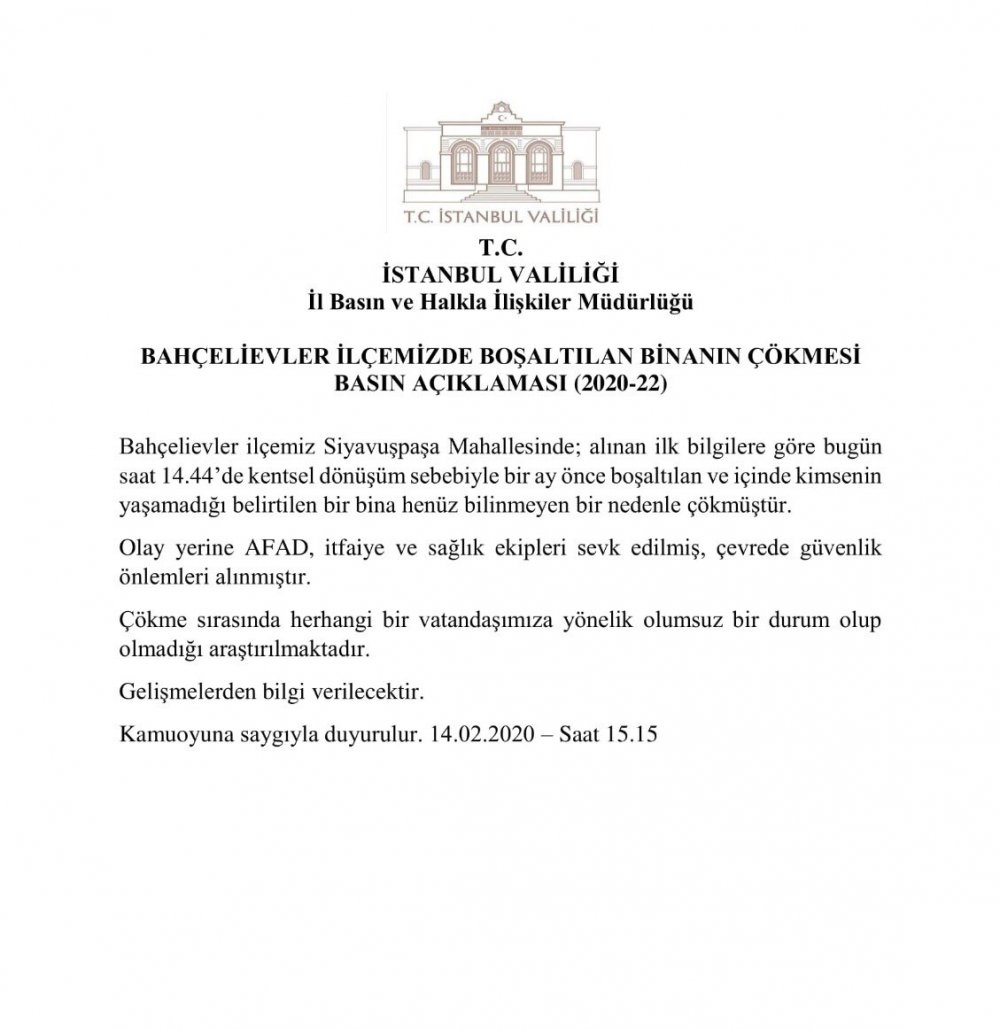 Bahçelievler ilçemiz Siyavuşpaşa Mahallesinde; alınan ilk bilgilere göre bugün saat 14.44’te kentsel dönüşüm sebebiyle bir ay önce boşaltılan ve içinde kimsenin yaşamadığı belirtilen bir bina henüz bilinmeyen bir nedenle çökmüştür.
