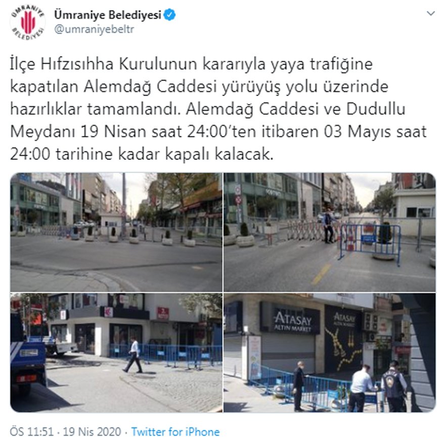 Ümraniye Belediyesi, Alemdağ Caddesi ve Dudullu Meydanı'nın 19 Nisan saat 24:00’ten itibaren 03 Mayıs saat 24:00'e kadar kapalı kalacağını duyurdu.