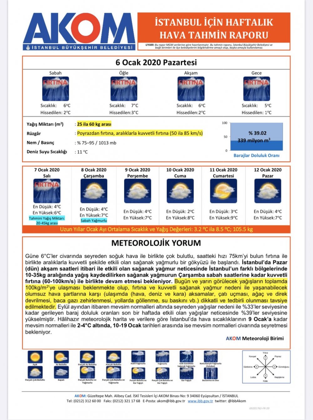 AKOM'a göre bugün ve yarın yağışlar toplamda 100kg/m2’yi bulacak. Fırtına ve kuvvetli yağış nedeniyle oluşacak olumsuz durumlara karşı dikkatli ve tedbirli olunması tavsiye edilmekte. Her türlü olumsuz durumda @ibbBeyazmasa diğer ekiplerle beraber 7/24 hizmet vermektedir.