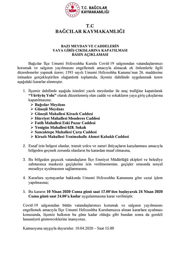 "Bağcılar İlçe Umumi Hıfsızsıhha Kurulu Covid-19 salgınından vatandaşlarımızı korumak ve salgının yayılmasını engellemek amacıyla alınacak ek önlemlerle ilgili düzenlemeler yapmak üzere: 1593 sayılı Umumi Hıfsızsıhha Kanunu'nun 26. maddesine istinaden olağanüstü toplantıda, ilçemiz dahilinde uygulanmak üzere aşağıdaki kararları almıştır."