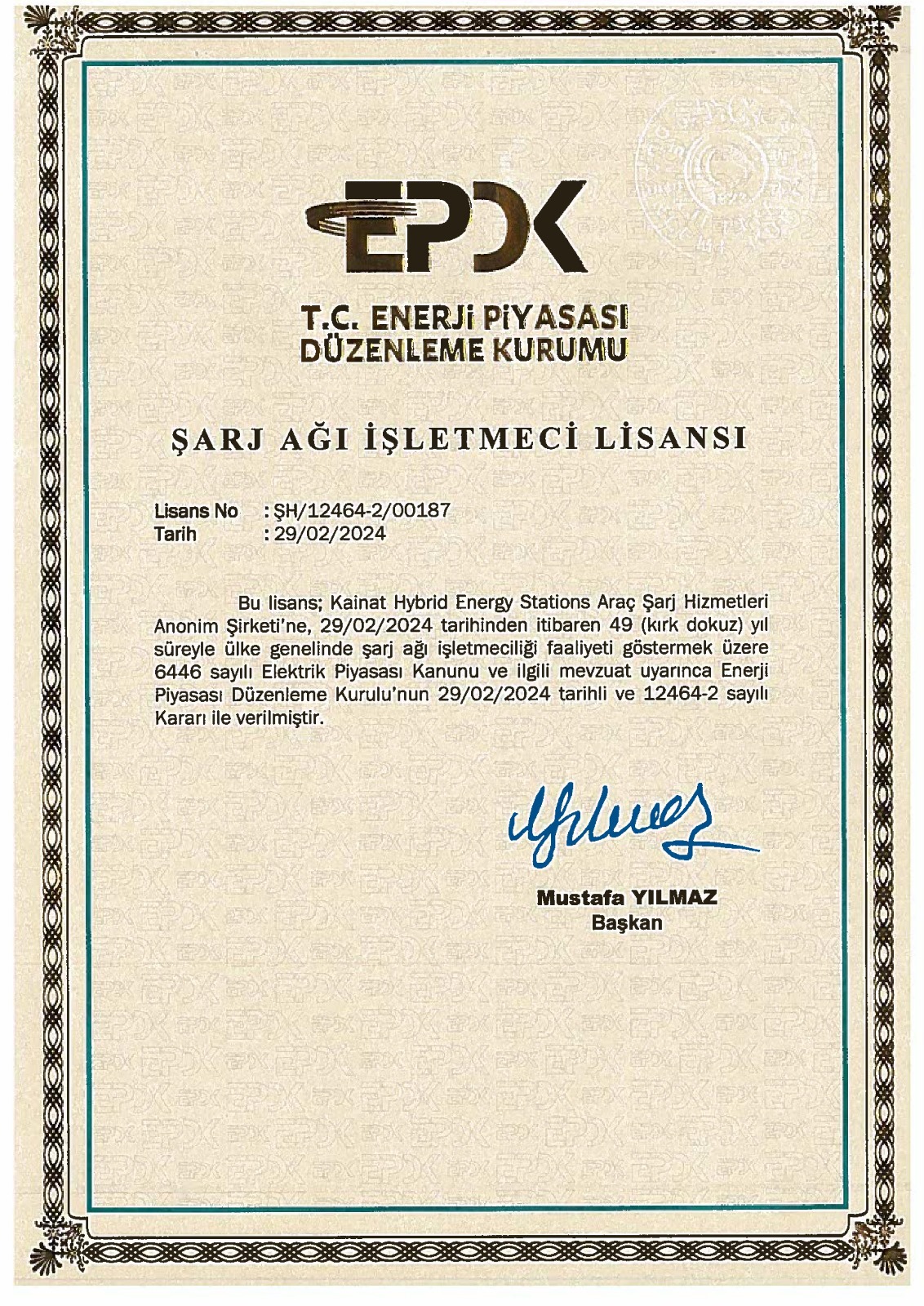 Kainat Holding bünyesinde faaliyet gösteren Kainat Hybrid Energy Stations Araç Sarj Hizmetleri Anonim Şirketi, 29 Şubat 2024 tarihinde EPDK tarafından verilen lisans ile ülke genelinde 49 yıl boyunca sarj ağı işletmeciliği yapma yetkisine sahip oldu. Bu lisans, 6446 sayılı Elektrik Piyasası Kanunu ve ilgili mevzuat çerçevesinde, EPDK'nın 29 Şubat 2024 tarihli ve 12464-2 sayılı kararıyla verildi.
