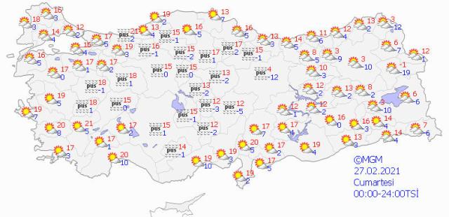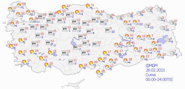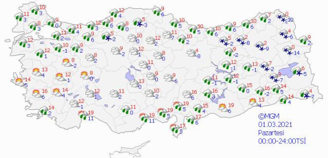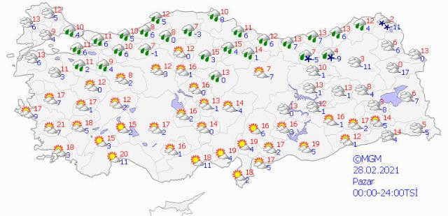Karadeniz kıyıları, İstanbul, Kocaeli, Yalova ve Kastamonu'nun kuzey ilçeleri ile Sinop çevrelerinin yağmurlu, Ardahan çevreleri ile Artvin'in yüksek kesimlerinin karla karışık yağmur ve kar yağışlı, diğer yerlerin az bulutlu ve açık geçeceği tahmin ediliyor.