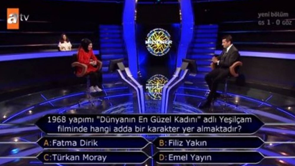 Kim Milyoner Olmak İster'in yayınlanan son bölümünde geceye 60.000 TL değerindeki "1968 yapımı 'Dünyanın En Güzel Kadını' adlı Yeşilçam filminde hangi adda bir karakter yer almaktadır?" sorusu damga vurdu.