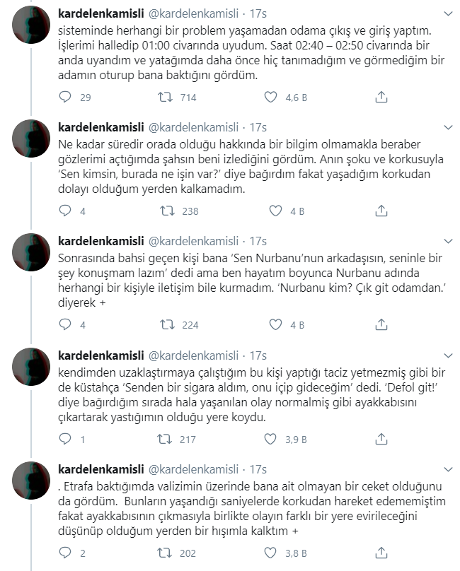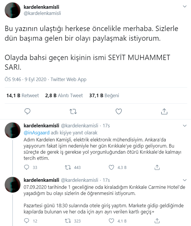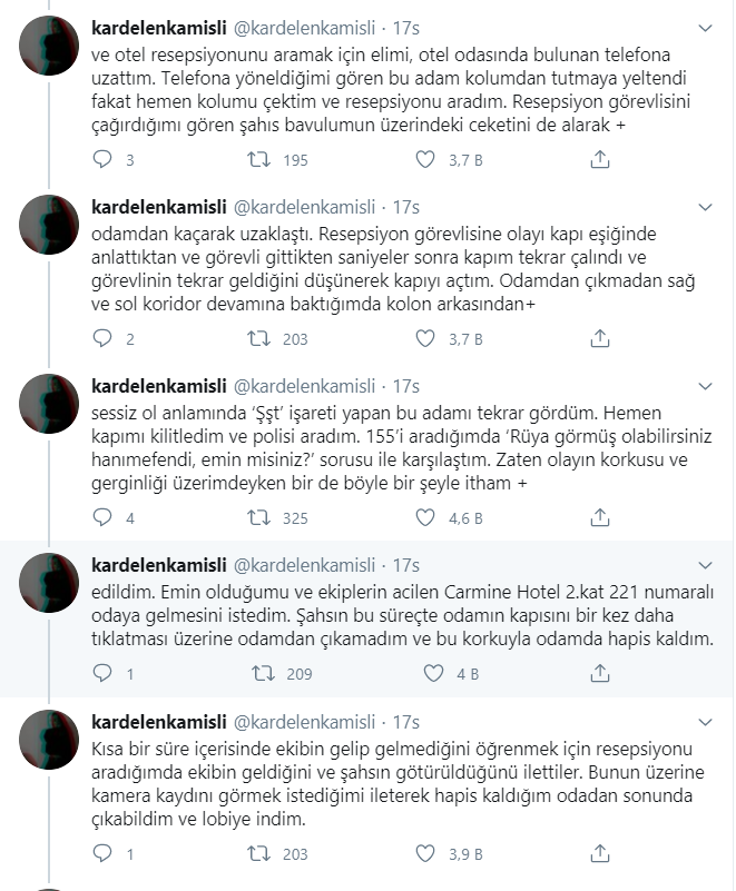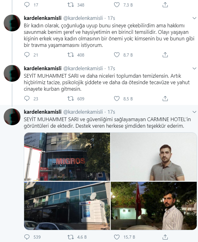 Bir tweet dizisi oluşturarak Carmine Hotel'deki yaşadıklarını anlatan Kardelen Kamışlı, bahsi geçen kişinin Seyit Muhammet Sarı olduğunu söyleyerek şu cümleleri kurdu:
