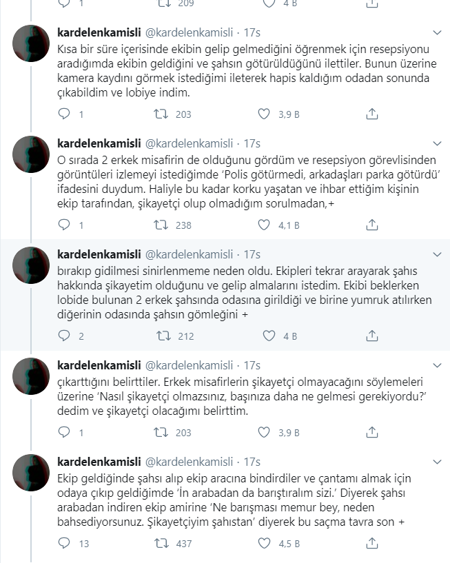 Ekibi beklerken lobide bulunan 2 erkek şahsında odasına girildiği ve birine yumruk atılırken diğerinin odasında şahsın gömleğini çıkarttığını belirttiler. Erkek misafirlerin şikayetçi olmayacağını söylemeleri üzerine ‘Nasıl şikayetçi olmazsınız, başınıza daha ne gelmesi gerekiyordu?’ dedim ve şikayetçi olacağımı belirttim.