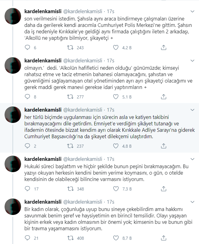 Emniyet’e verdiğim şikâyet tutanağı ve ifademin ötesinde bizzat kendim ayrı olarak Kırıkkale Adliye Sarayı’na giderek Cumhuriyet Başsavcılığı’na da şikayet dilekçemi ulaştırdım. Hukuki süreci başlattım ve hiçbir şekilde bunun peşini bırakmayacağım. Bu yazıyı okuyan herkesin kendini benim yerime koymasını, o gün, o otelde kendisinin de olabileceği bilincine varmasını istiyorum. Bir kadın olarak, çoğunluğa uyup bunu sineye çekebilirdim ama hakkımı savunmak benim şeref ve haysiyetimin en birincil temsilidir.