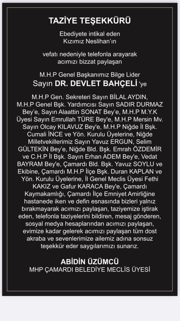 "Ebediyete intikal eden kızımız Neslihan'ın vefatı nedeniyle telefonla arayarak acımızı paylaşan MHP Genel Başkanımız Bilge Lider Sayın Devlet Bahçeli'ye, MHP Genel Sekreteri Sayın Bilal Aydın, MHP Genel Başkan Yardımcısı Sayın Sadır Durmaz Bey, 'e, Sayın Alaattin Sonat Bey'e, MHP MYK üyesi Sayın Emrullah Türe Bey'e, MHP Mersin Milletvekili Sayın Olcay Kılavuz Bey'e, MHP Niğde İl Başkanı Cumali İnce ve yönetim kurulu üyelerine, Niğde milletvekillerimiz Sayın Yavuz Ergun, Selim Gültekin Bey'e, Niğde Belediye Başkanı Emrah Özdemir ve CHP İl Başkanı Sayın Erhan Adem Bey'e Vedat Bayram Bey'e, Çamardı Belediye Başkanı Yavuz Soylu ve ekibine, Çamardı MHP İlçe Başkanı Duran Kaplan ve yönetim kurulu üyelerine, İl Genel Meclis üyesi Fethi Kakız ve Gafur Karaca Bey'e, Çamardı Kaymakamlığı, Çamardı İlçe Emniyet Amirliğine, hastanede ve defin esnasında bizleri yalnız bırakmayarak acımızı paylaşan, taziyemize iştirak eden, telefonla taziyelerini bildiren, mesaj gönderen, sosyal medya hesaplarından acımızı pyalaşan, evimize başsağlığına gelen tüm dost, akraba ve sevenlerimize ailemiz adına sonsuz teşekkür eder saygılarımızı sunarız."