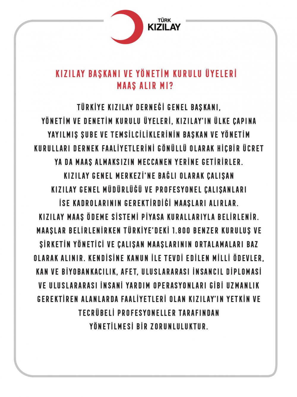 Raporda ayrıca son günlerde tartışma konusu olan, “Kızılay devlet kurumu mu?”; “Kızılay Başkanı ve Yönetim Kurulu üyeleri maaş alır mı?”; “Deprem vergileri varken Kızılay neden yardım istiyor”; “Kızılay başkanlık ofisi köşk veya yalı mı?”; “Suriyelilere neden yardım ediyorsunuz? Suriyeliler sizden maaş alıyor mu?”; “Başkentgaz üzerinden Kızılay’a yapılan 8 milyon dolar bağışı neden Ensar Vakfı’na verdiniz?” gibi altı soruyla ilgili yanıt verildi.