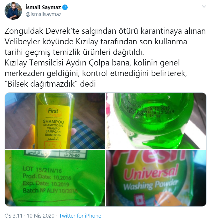 Zonguldak Devrek’te salgından ötürü karantinaya alınan Velibeyler köyünde Kızılay tarafından son kullanma tarihi geçmiş temizlik ürünleri dağıtıldı. Kızılay Temsilcisi Aydın Çolpa bana, kolinin genel merkezden geldiğini, kontrol etmediğini belirterek, “Bilsek dağıtmazdık” dedi.