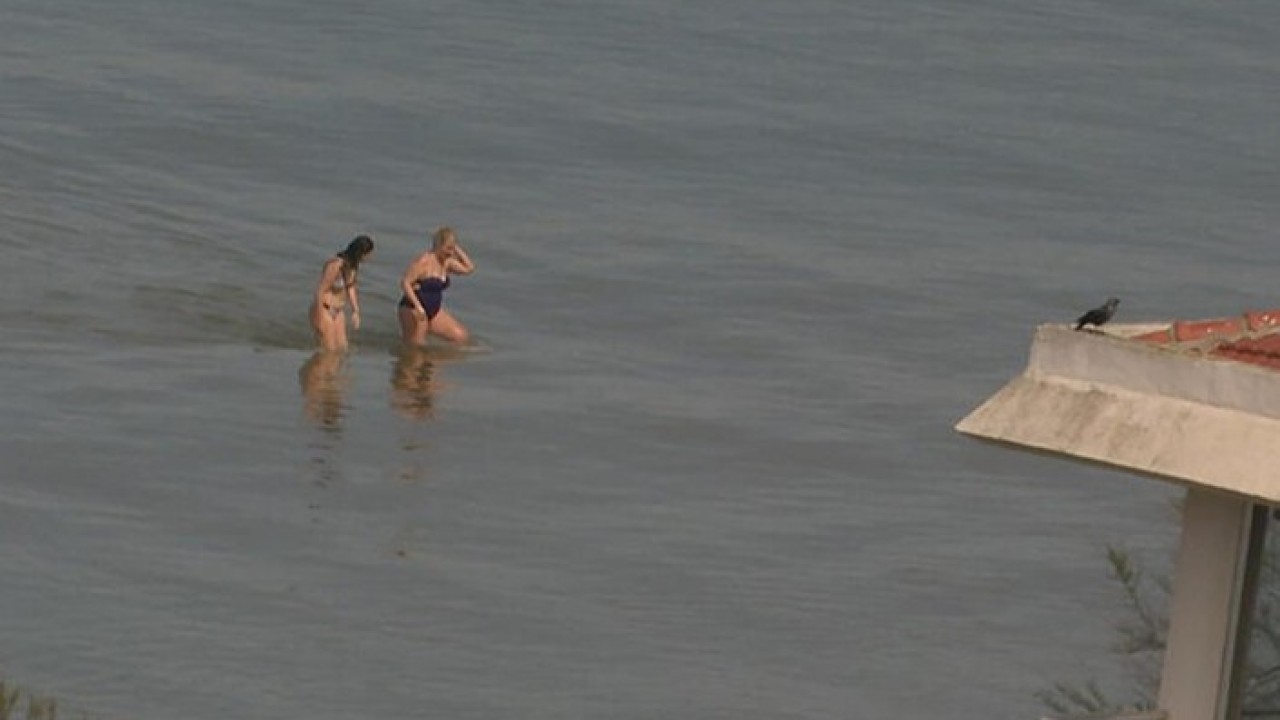 Güneşli havayı fırsat bilen iki kadının serinlemek için denize girerek yüzmeleri ile vatandaşların gruplar halinde sahilde dolaşmaları anbean görüntülendi