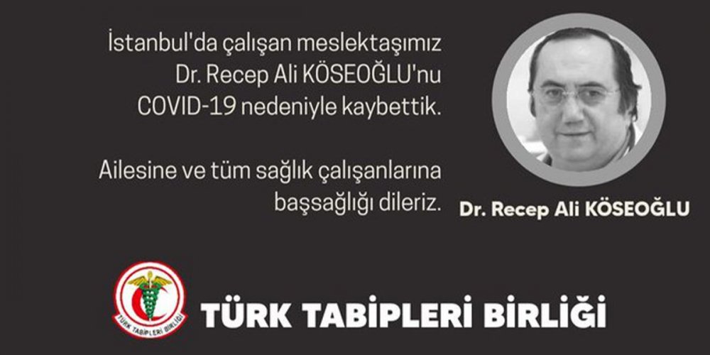 Türk Tabipleri Birliği (TTB), sosyal medya hesabından yaptığı açıklamada “İstanbul’da çalışan meslektaşımız Dr. Recep Ali KÖSEOĞLU’nu COVID-19 nedeniyle kaybettik. Ailesine ve tüm sağlık çalışanlarına başsağlığı dileriz” ifadelerini kullandı.