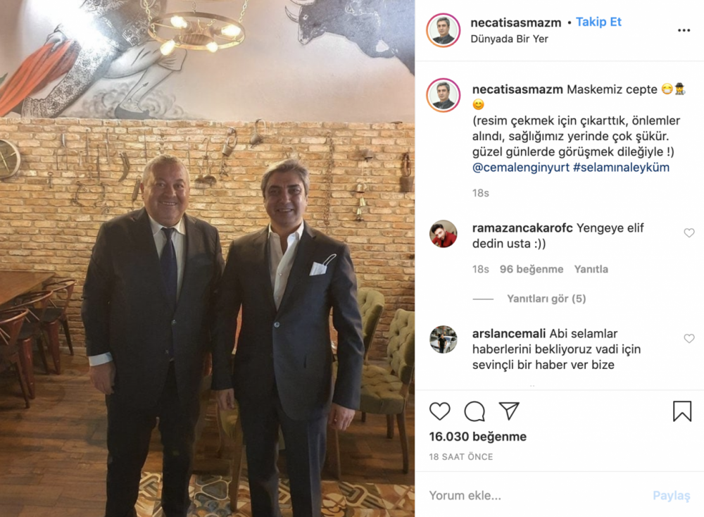 Şaşmaz, MHP Ordu Milletvekili Cemal Enginyurt ile bir araya geldiği görüntüleri sosyal medya hesabından paylaşarak, "Maskemiz cepte. Resim çekmek için çıkarttık, önlemler alındı, sağlığımız yerinde çok şükür. güzel günlerde görüşmek dileğiyle" ifadelerini kullandı.