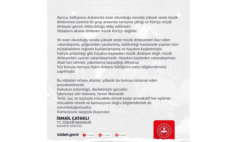 İçişleri Bakanlığı Sözcüsü İsmail Çataklı tarafından yapılan açıklamada da, “Ezan okunurken yüksek sesle müzik dinleyenleri ikaz eden vatandaşımız göğsünden yaralanmış, kaldırıldığı hastanede yapılan tüm müdahalelere rağmen kurtarılamamış ve hayatını kaybetmiştir. Hayatını kaybeden müzik dinleyen değil, müzik dinleyenleri uyaran vatandaşımızdır” denildi.