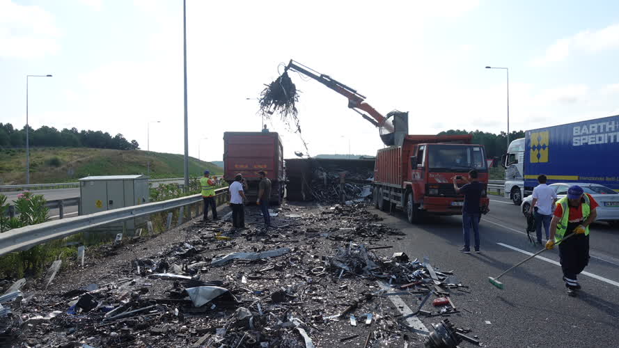 Kuzey Marmara Otoyolu Uskumruköy mevkisinde, Yavuz Sultan Selim Köprüsü istikametine seyir halinde olan 54 ZZ 026 plakalı hurda yüklü kamyon, sürücünün direksiyon hakimiyetini kaybetmesi sonucu devrildi.