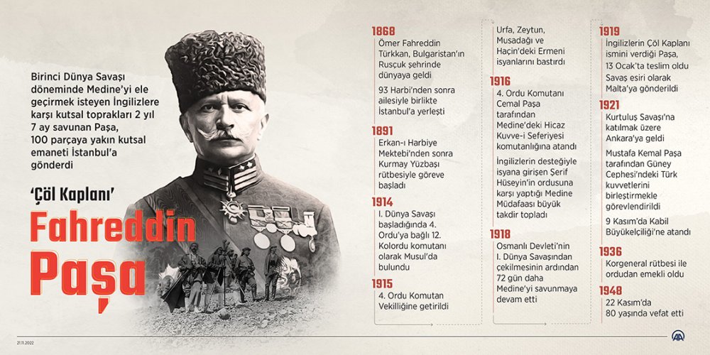 ‘Çöl Kaplanı’ Fahreddin Paşa, Birinci Dünya Savaşı döneminde Medine’yi ele geçirmek isteyen İngilizlere karşı kutsal toprakları 2 yıl 7 ay savunan Paşa, 100 parçaya yakın kutsal emaneti İstanbul'a gönderdi.