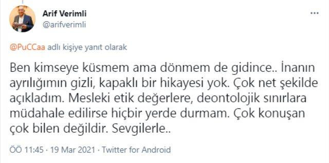 Programda bir diğer danışman olan Şevki Sözen'e kırgınlığı nedeniyle ayrılık kararı alan Arif Verimli, Twitter hesabından Pucca isimli kullanıcının paylaşımına yanıt verdi.