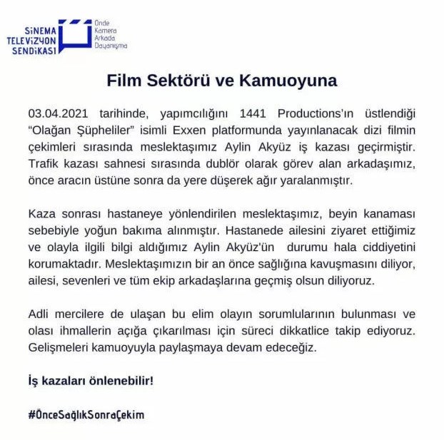 Dizide dublör olarak görev yapan Aylin Akyüz, sette geçirdiği kazanın ardından hastaneye kaldırıldı. Beyin kanaması geçiren Akyüz, yoğun bakıma alındı.