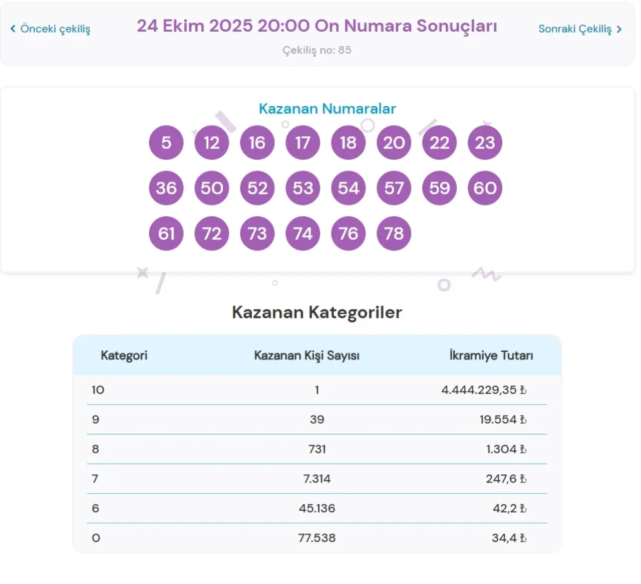 24 Ekim akşamı düzenlenen çekilişte; 10 bilen 1 kişi büyük ikramiyeyi kazandı ve 4.444.229,35 TL ödül aldı. 9 bilen 39 kişinin kazancı ise 19.554 TL oldu. Diğer ikramiye gruplarında 8, 7 ve 6 bilenler ile hiç numara bilmeyenler de ödül aldı. Sonuçlar, hem millipiyangoonline.com'dan hem de canlı çekiliş sonrası Youtube kanalı üzerinden duyuruldu. Çekilişlere katılım miktarı ve seçilen rakam kombinasyonları, ödül havuzunun büyüklüğünü etkiliyor.