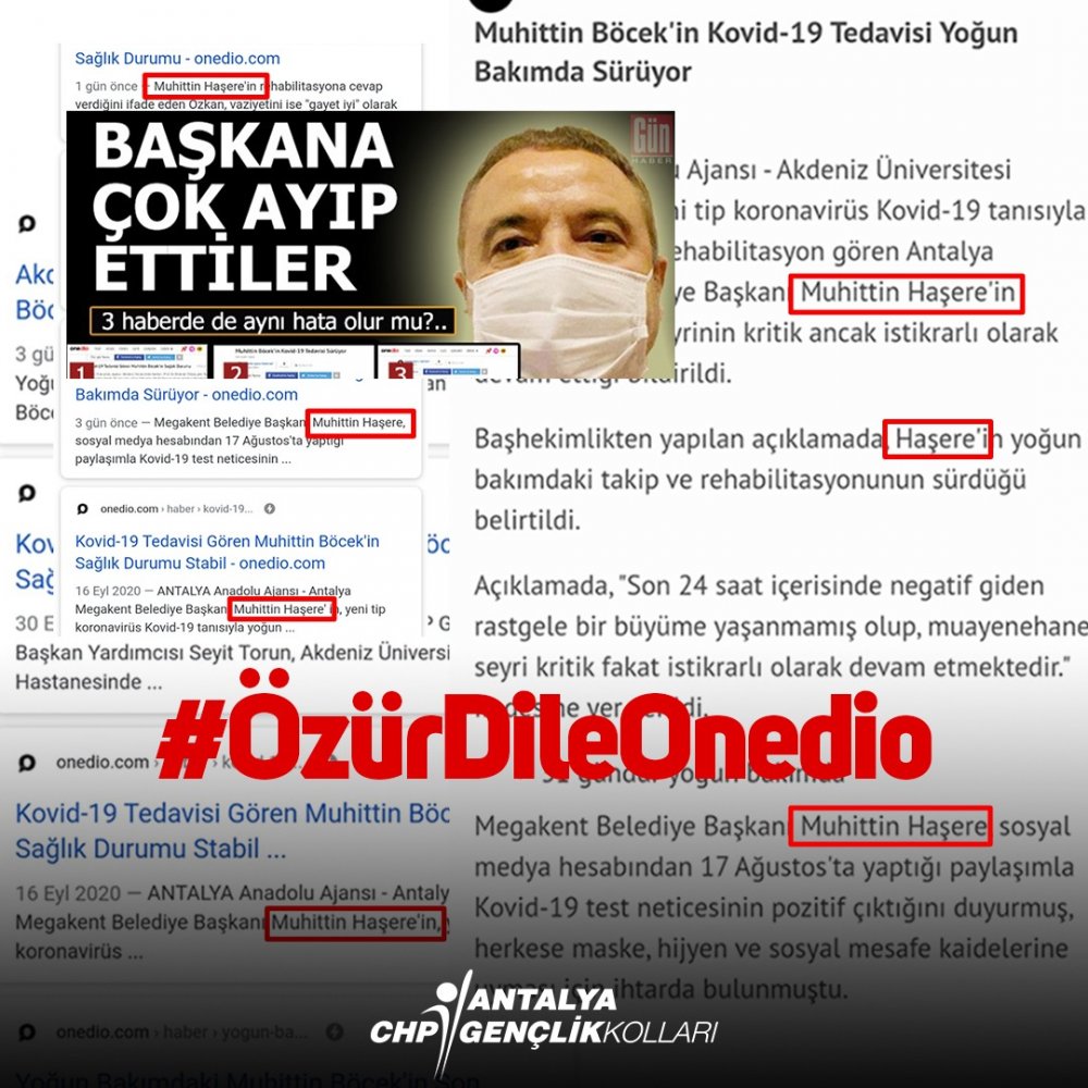 Onedio isimli içerik üreticisinin farklı tarihlerde yapmış olduğu haberlerde, yoğun bakımda olan ve yaşam savaşı veren Antalya Büyükşehir Belediye Başkanı Muhittin Böcek’in soyadı “Haşere” olarakyazıldı.